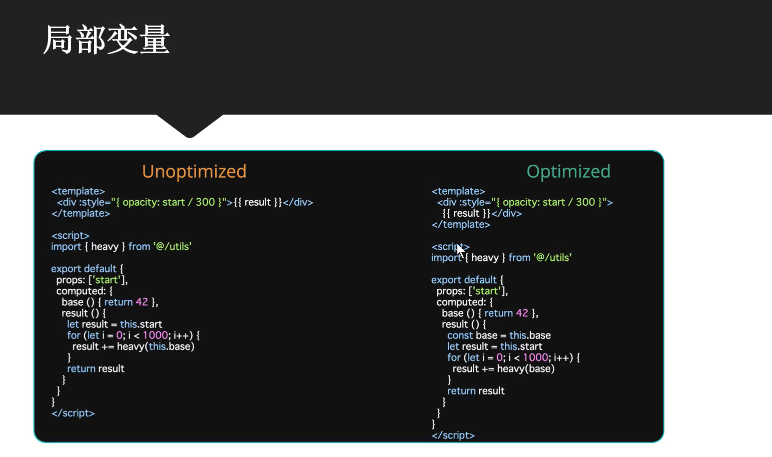 vue中所绑定的属性都是响应式的,减少对响应式的数据频繁更改,在对响应式数据作为引用并更改时,尽量将响应式的数据作为局部变量做处理!计算属性中的base值若发生变化,则计算属性会在做一次相应的计算处理,那么以下对base值做了1000次处理,因此计算属性便会处理1000次!然而将base做为常量接收时,便不会对原计算属性中的base值做处理,base值不做改变,计算属性(有缓存,值若不发生变化,计算属性就会引用原有的值)便就不会触发处理行为!