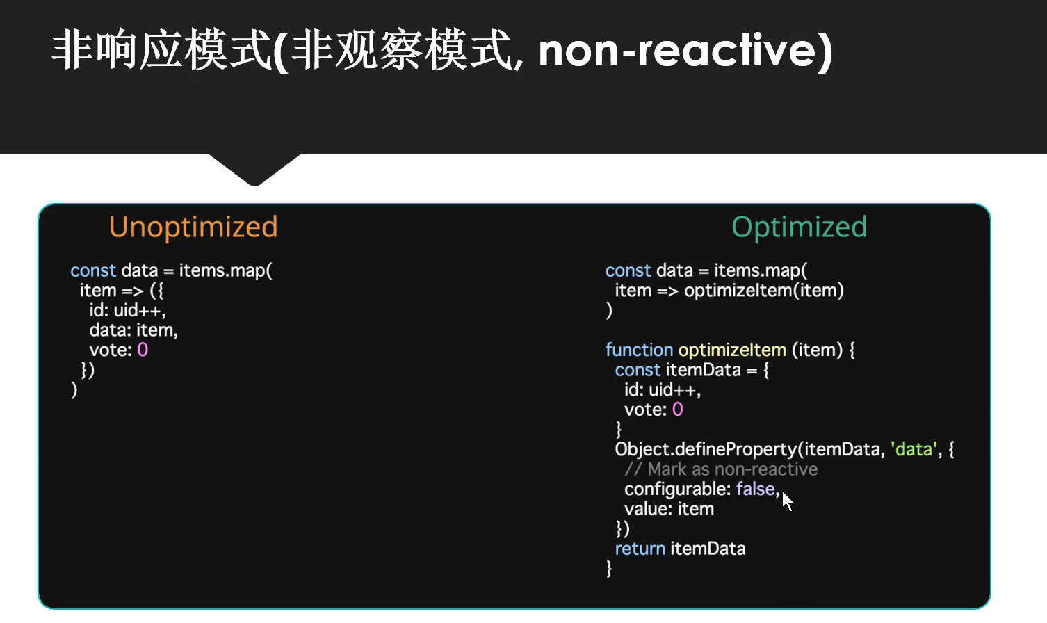 如果你有一个巨大的数组或Object,并且确信数据不会修改,使用Object.freeze()可以让性能大幅提升。在我的实际开发中,这种提升大约有5~10倍,倍数随着数据量递增,对于纯展示的大数据,都可以使用Object.freeze提升性能。
