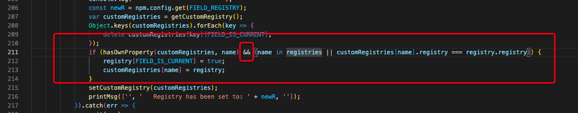 找到nrm全局安装的位置,在nrm 全局文件下 /usr/local/lib/node_modules/nrm,打开cli.js,找到第211行的代码